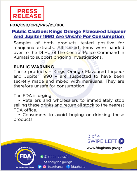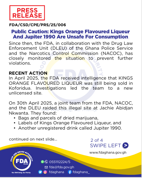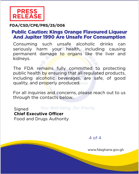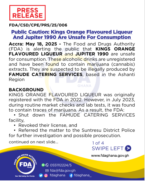 The Food and Drugs Authority (FDA) has issued a critical warning to the public regarding the sale and consumption of two alcoholic beverages: Kings Orange Flavoured Liqueur and Jupiter 1990. Both products have been found to contain cannabis extracts and are classified as unsafe for human consumption.
