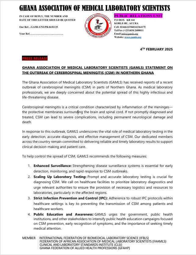 The Ghana Association of Medical Laboratory Scientists (GAMLS) has expressed serious concerns regarding a recent outbreak of cerebrospinal meningitis (CSM) in parts of Northern Ghana.