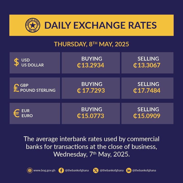 These rates serve as a standard for foreign exchange dealings within the country. However, it is important to note that the rates provided by commercial banks can differ. For instance, Stanbic Bank Ghana reported its rates for May 7 as follows:
