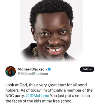 In a surprising turn of events, renowned comedian Mischael Blackson has publicly declared his allegiance to the ruling National Democratic Congress (NDC) following the government’s recent payment of over 6 billion Ghana Cedis to the Domestic Debt Exchange Program (DDEP). This announcement was made via his X account, where he expressed his excitement about the financial relief provided to bondholders.