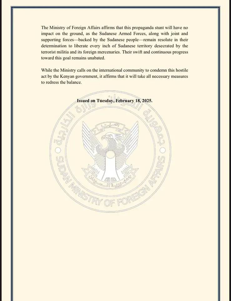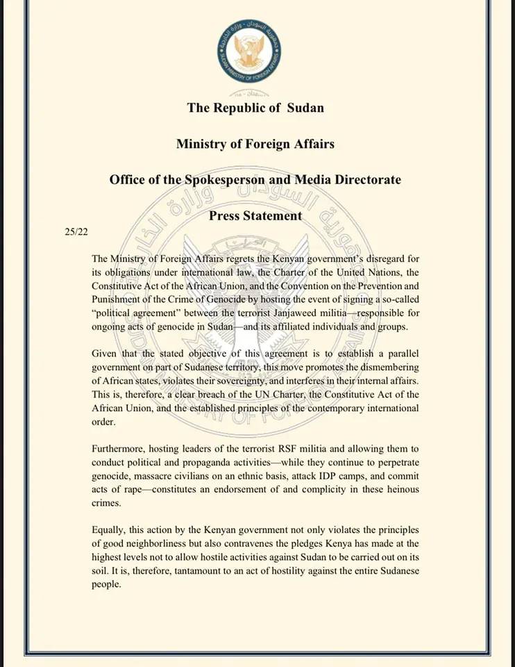 Sudan’s Foreign Ministry has issued a strong rebuke to Kenyan President William Ruto for hosting leaders of the Rapid Support Forces (RSF), a paramilitary group accused of committing genocide in Sudan. The ministry expressed regret over what it described as Kenya’s failure to uphold its obligations under international law, the United Nations Charter, and the Genocide Convention by allowing the RSF to gather and conduct political activities on Kenyan soil.
